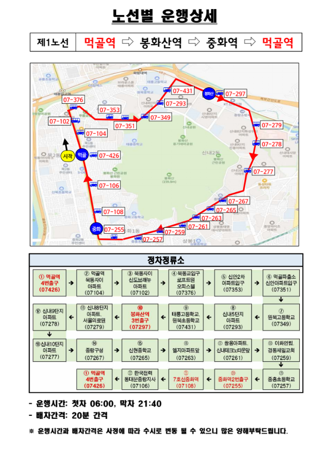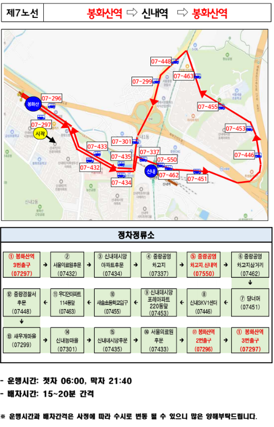 • 봉화산역 → 서울의료원후문 → 신내역 → 신내SKV1 → 우디안아파트 → 중랑경찰서후문 → 새우개마을 → 서울의료원후문 → 봉화산역
