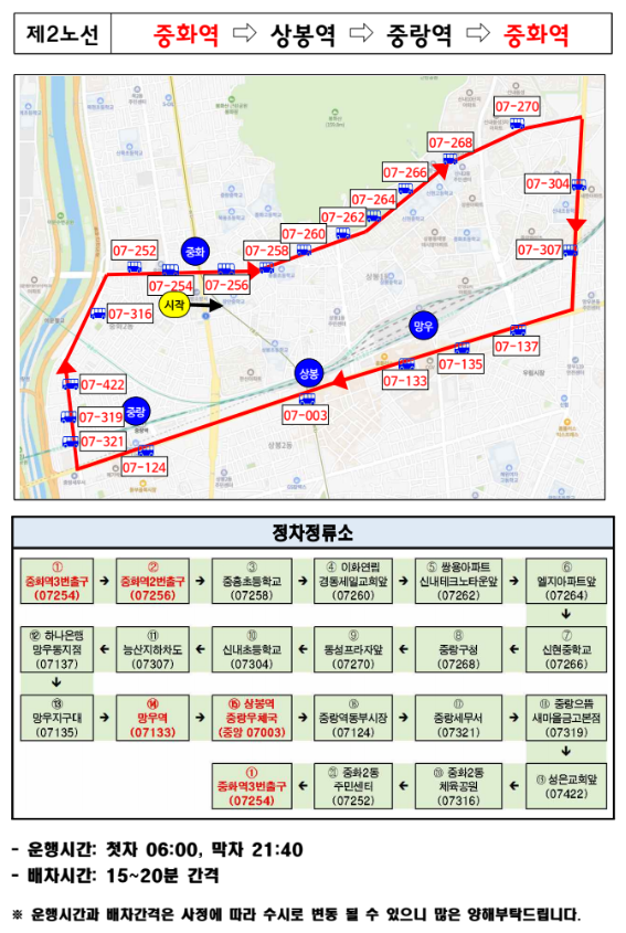 • 중화역 → 중랑구청 → 신내초 → 망우역 → 상봉역 → 중화2동새마을금고 → 중화2동체육공원 → 중화역