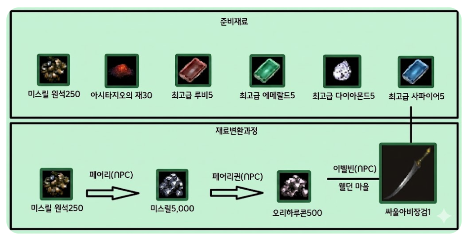 가장 많이 필요한 재료는 오리하루콘입니다. 오리하루콘은 미스릴을 재료로 제작할 수 있는데, 보통 미스릴 10개를 사용해 오리하루콘 1개를 만드는 방식으로 준비합니다. 미스릴은 난쟁이 계열 몬스터 등을 통해 수급할 수 있습니다.
