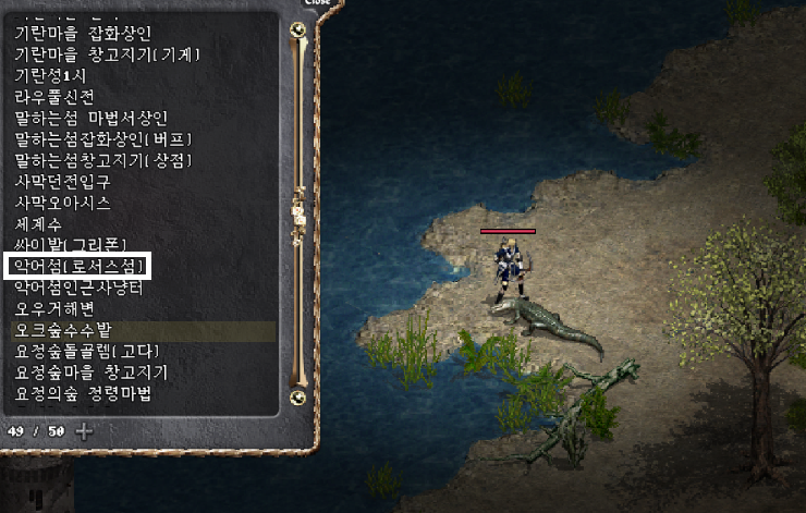 로서스섬은 도보로 이동이 불가하기 때문에 ‘텔레포트 or 순간이동주문서’를 통해 ‘악어섬’에 도착할 때까지 계속 텔레포트를 사용해야 합니다. (그렇기 때문에 로서스섬 인근에서 ‘/기억’ 으로 장소를 기억한 후에 계속 텔레포트를 시도해야 함.)